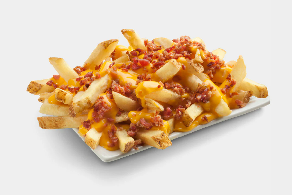 Cheese and Bacon Fries are made with our all-natural cut potatoes, tossed in salt, smothered with signature melted cheddar cheese sauce and sprinkled with crispy bacon bits.