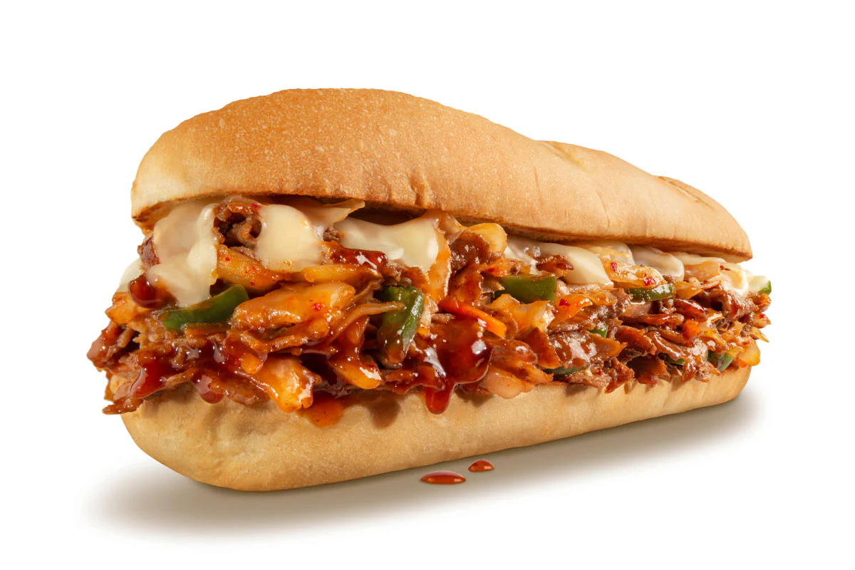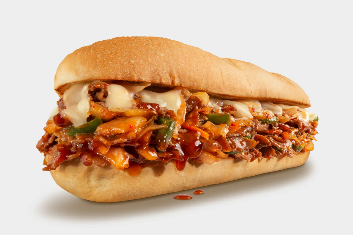 The Kimchi Cheesesteak is made with USDA choice steak marinated in sweet and smoky Gochujang Sauce, topped with sautéed onions, peppers, sriracha mayo, and spicy kimchi. This cheesesteak comes with melted provolone cheese, all piled on our signature toasted roll.