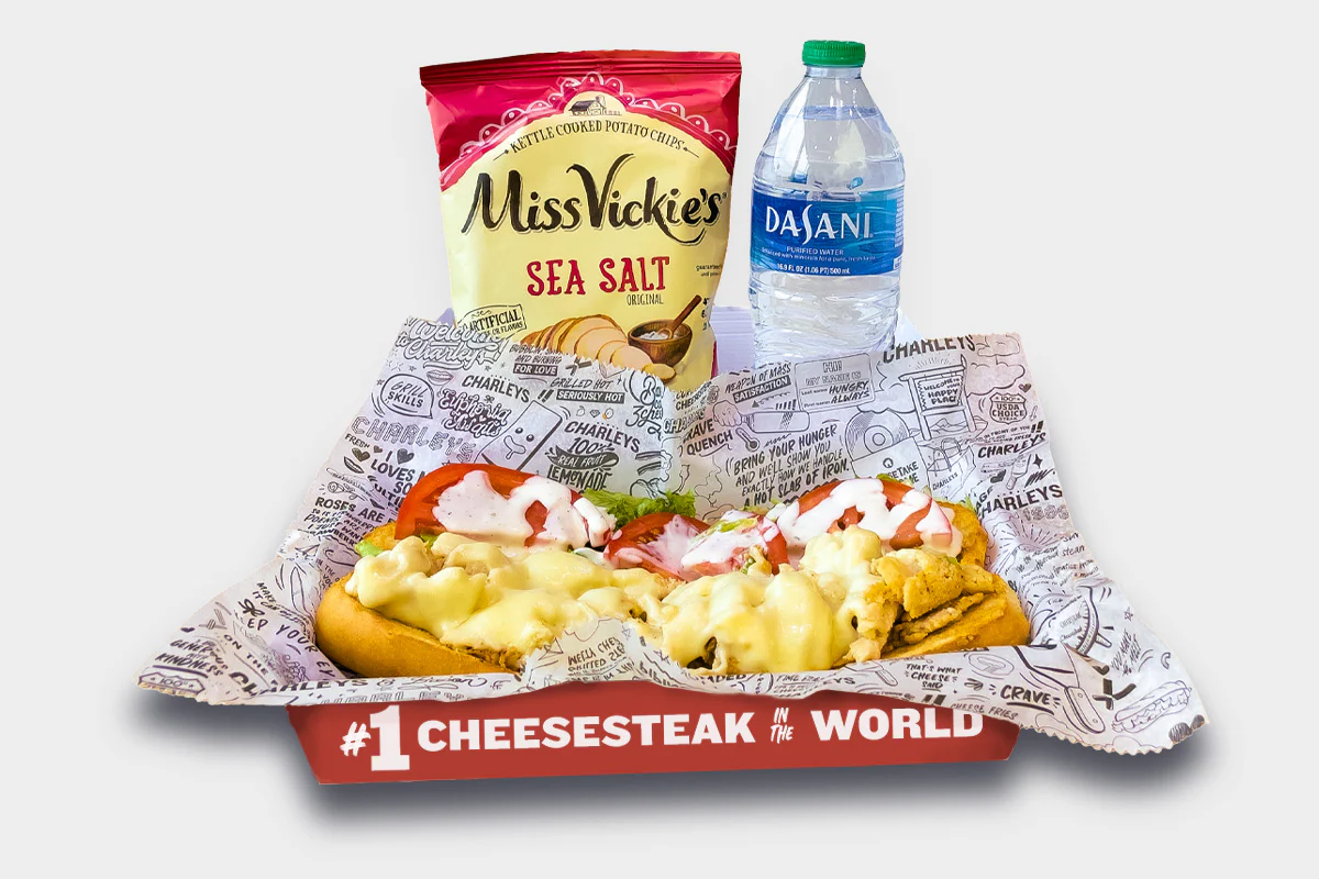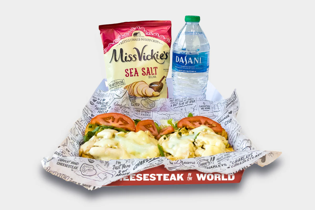Charleys Chicken Cheesesteak Boxed Meal includes a chicken cheesesteak made with grilled all-white meat chicken, onions, and green peppers topped with melted provolone cheese and served on our signature toasted roll. Lettuce, tomato, and mayonnaise packets are provided on the side. Consider adding Miss Vickie's Chips, Dasani bottled water, and a Chocolate Chunk Cookie to complete your meal.