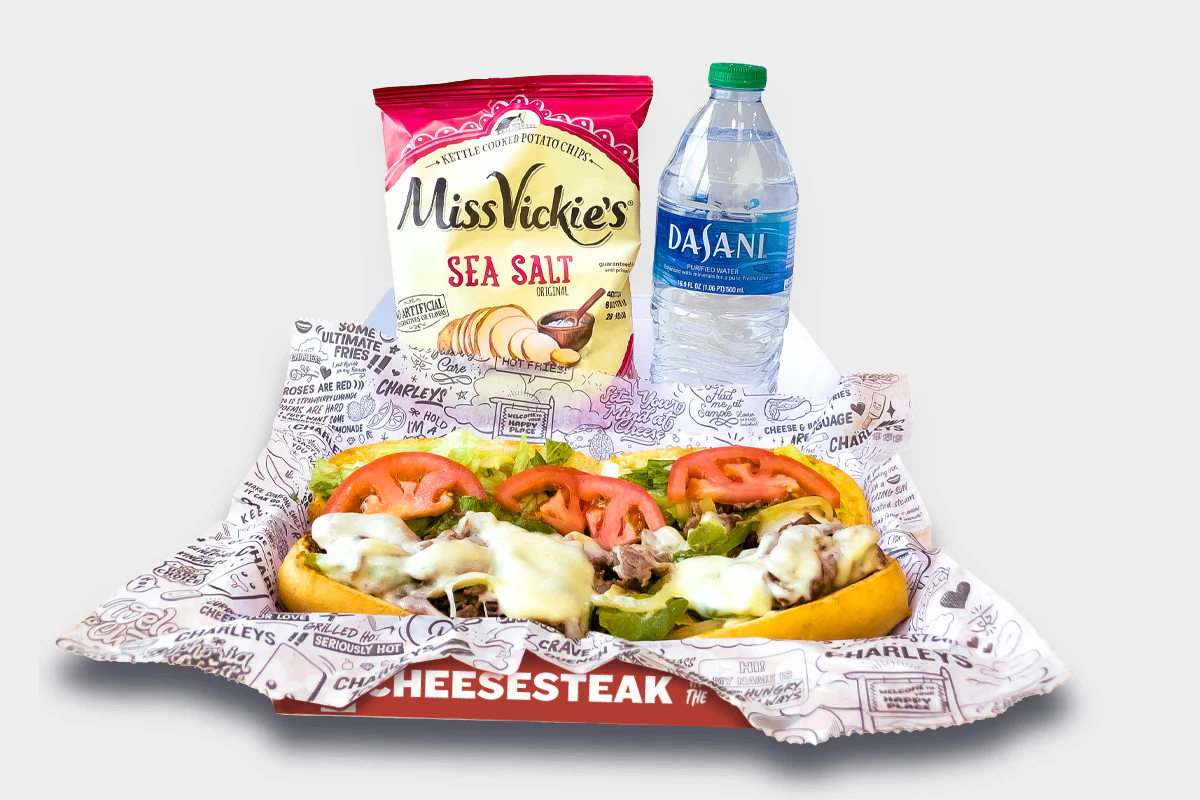 Charleys Steak Cheesesteak Boxed Meal includes a steak cheesesteak made with grilled USDA choice steak, onions, and green peppers topped with melted provolone cheese and served on our signature toasted roll. Lettuce, tomato, and mayonnaise packets are provided on the side. Consider adding Miss Vickie's Chips, Dasani bottled water, and a Chocolate Chunk Cookie to complete your meal.